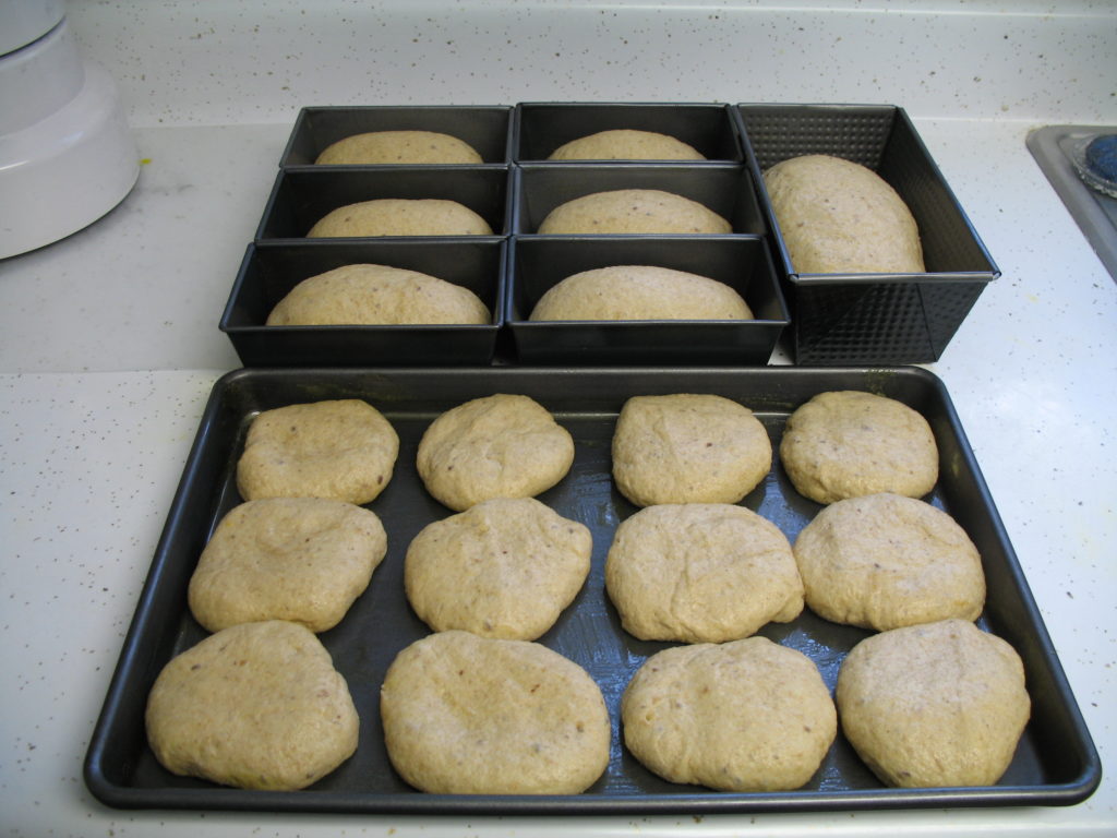 - I bake in 8½ x 4½” pans; the bigger ones (9×5) tend to make flatter loaves. My husband really like the mini loaves, too (half the capacity of a regular pan); here you see six half loaves and one 8.5 x 4.5 pan, plus the baking sheet.