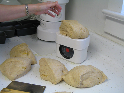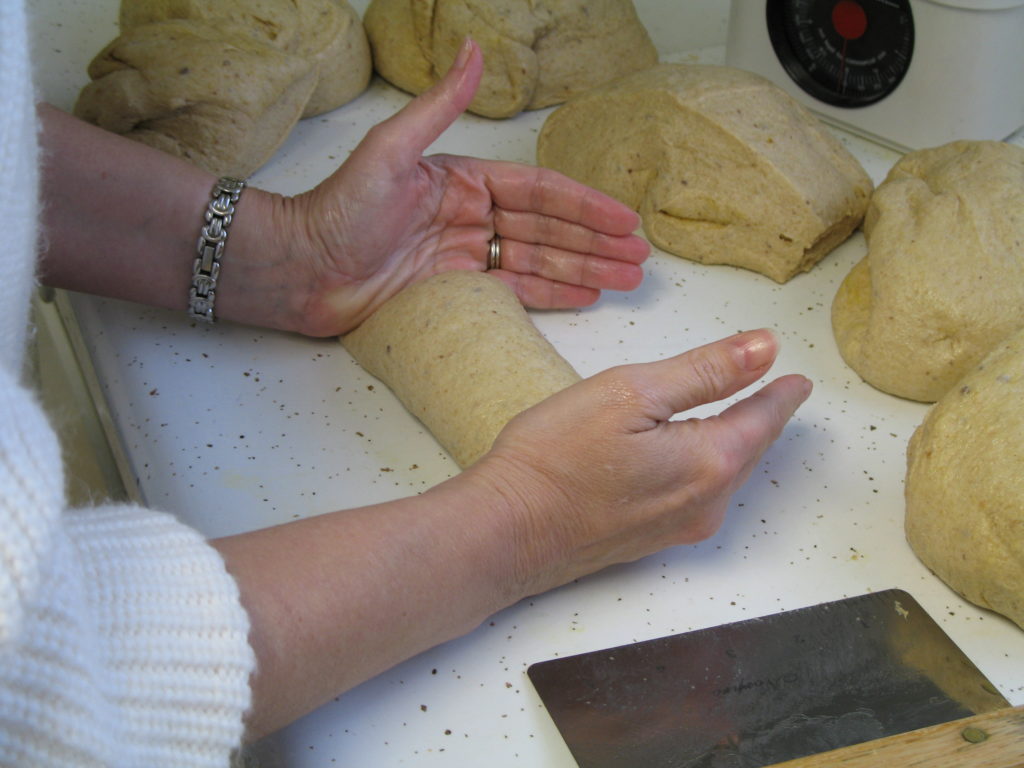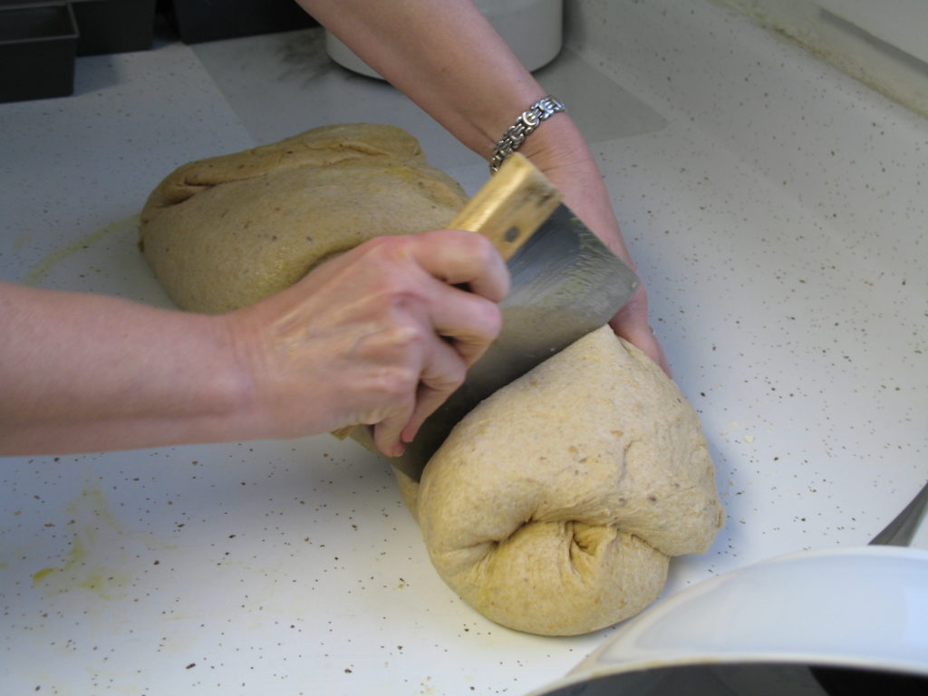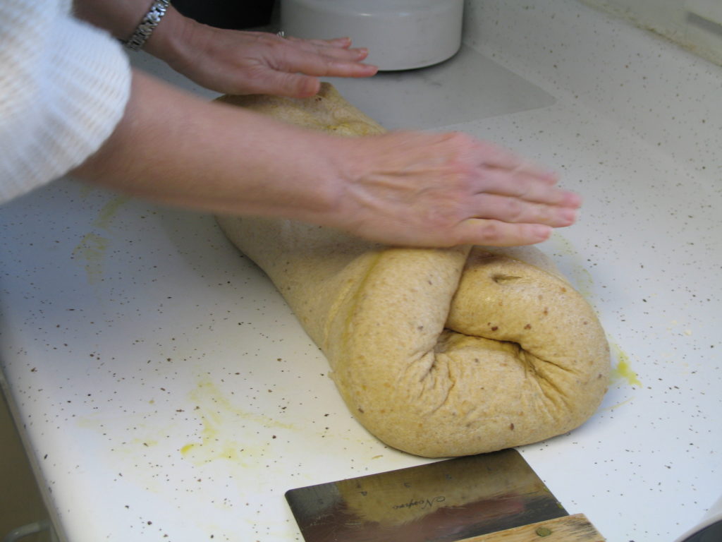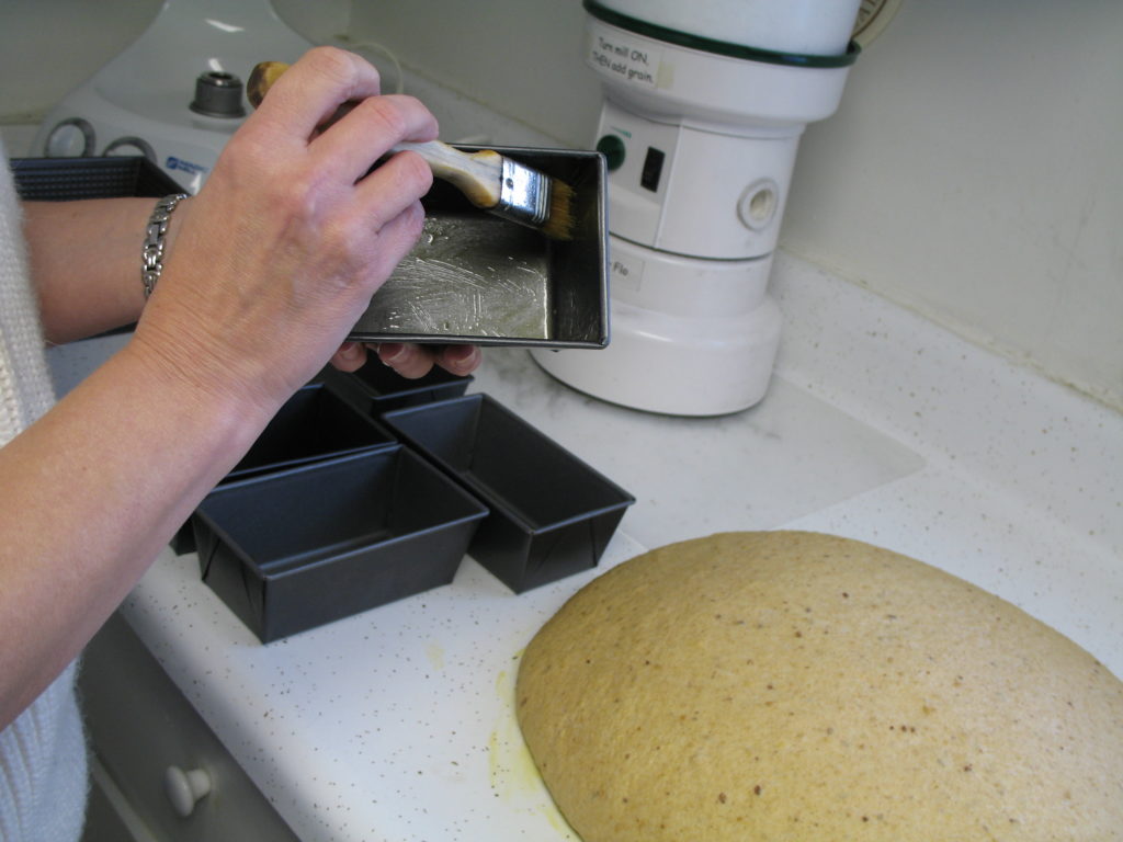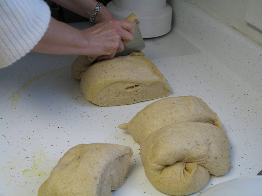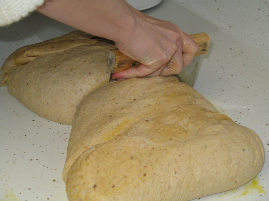 (4) Punch down dough. Using oiled hands on oiled counter, divide dough into two parts and shape into loaves. At this point, I knead it by hand a few times if it’s still tacky to the touch, and that usually takes out the “sticky.” Let rise in prepared pans till double in bulk, then bake 30 minutes at 350. Remove from pans to cool on racks. Bread is done when an instant-read thermometer reads 195-200 or bottom sounds hollow when tapped.