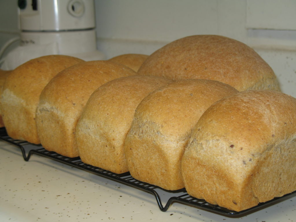 (Note that I made one full-size loaf, shown in back of cooling loaves — hence the size difference)
